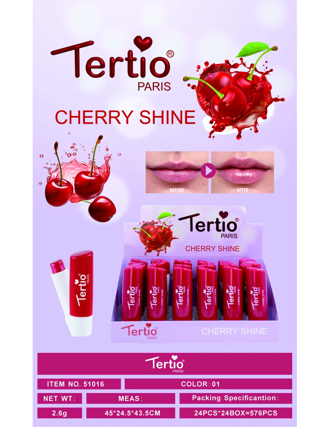 El Tertio Cherry Shine aporta un brillo jugoso con un suave tono cereza.