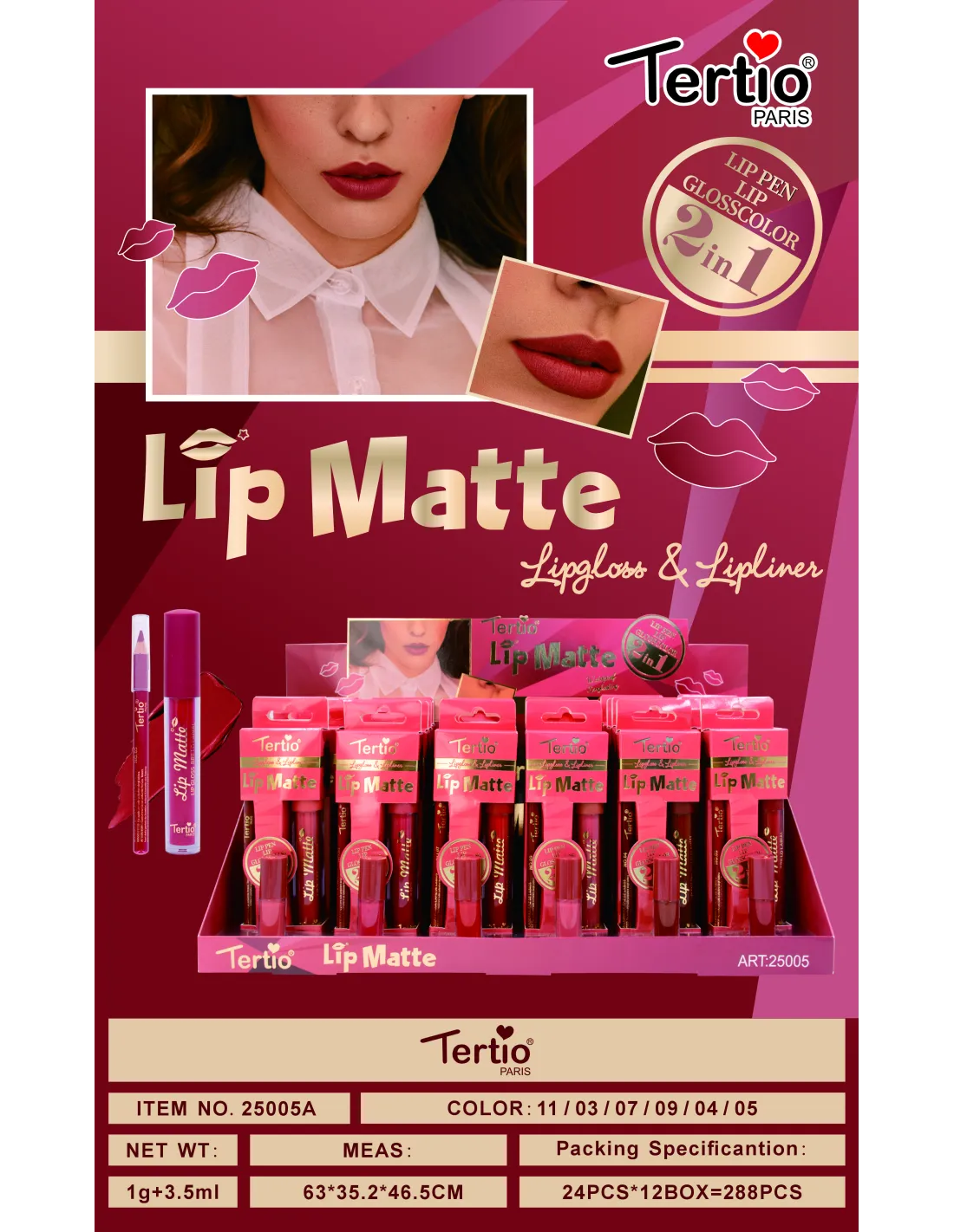 El Tertio Lip Matte 2 en 1 combina lipliner + lipgloss mate en un solo producto.