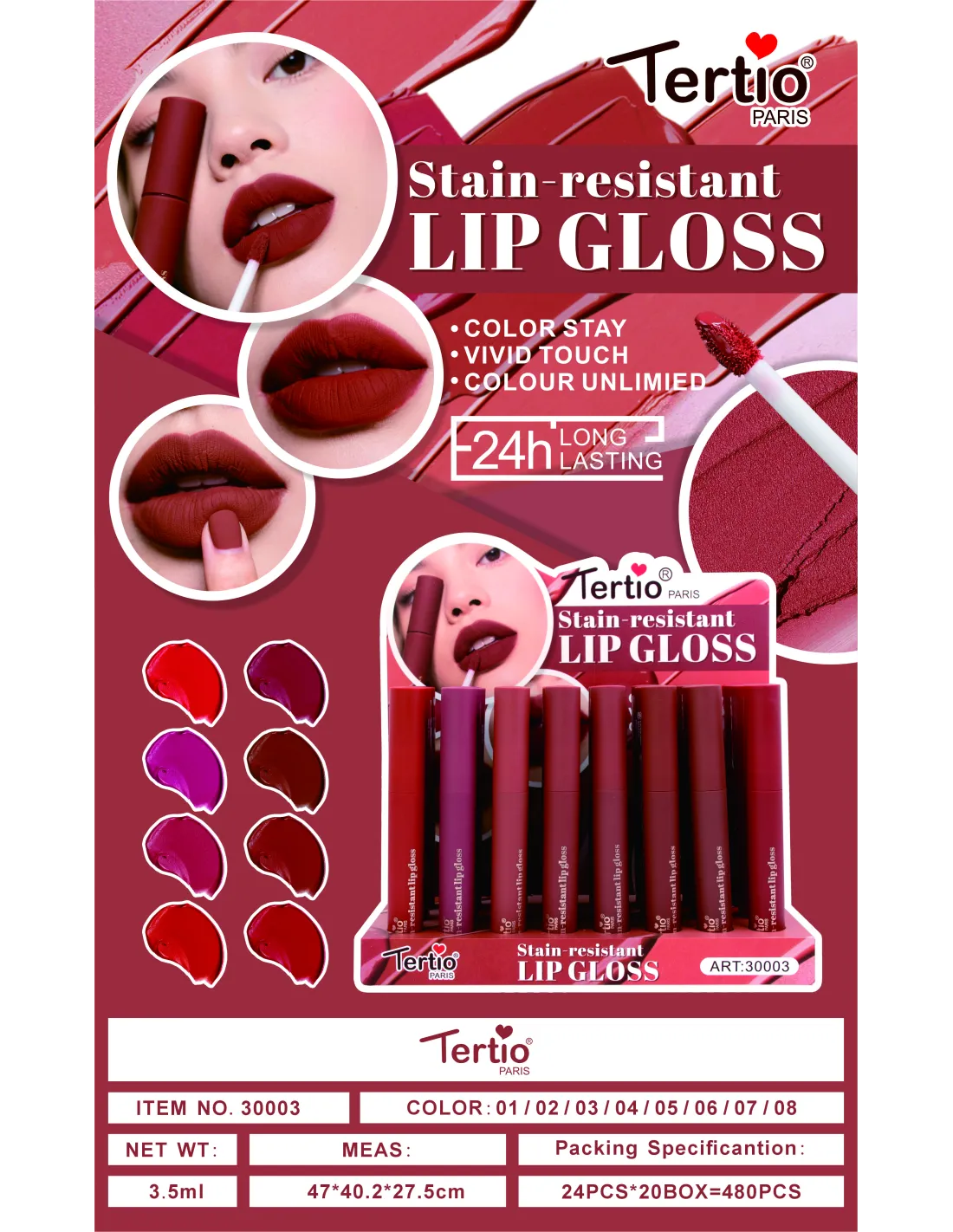 El Tertio Stain-resistant Lip Gloss es un brillo de labios de larga duración, desarrollado para venta profesional y distribución mayorista. Su fórmula de alta pigmentación ofrece un color intenso y uniforme con excelente adherencia, ayudando a reducir la transferencia y mantener el color durante horas.