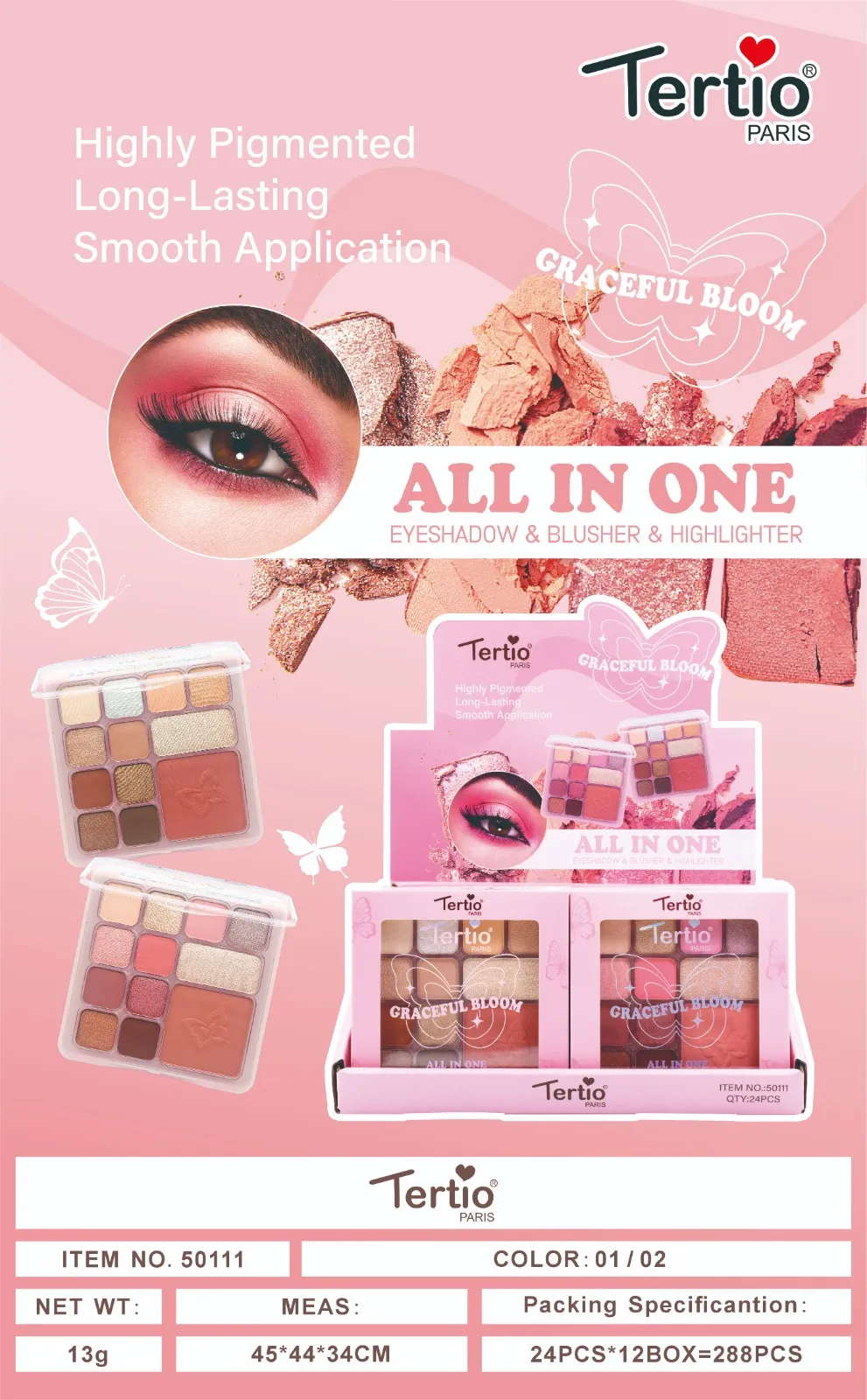 Tertio Graceful Bloom – Paleta ALL IN ONE (Sombra + Colorete + Iluminador) 13g